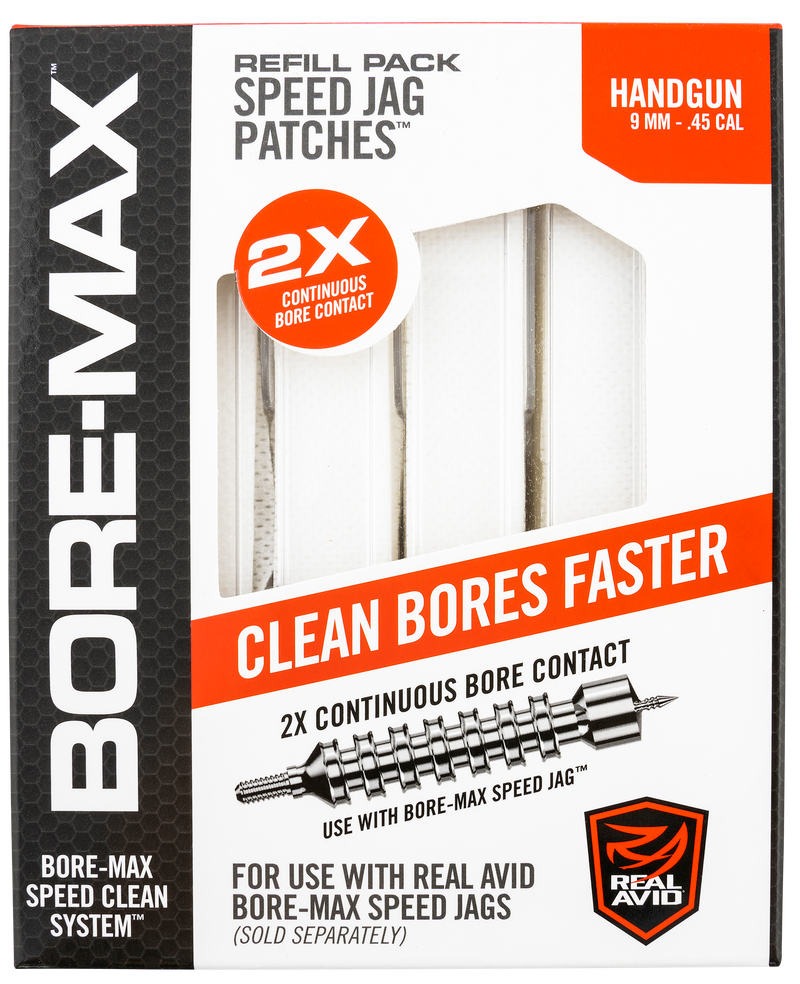 Real Avid Bore-Max Speed Jag Patches are synthetic cleaning patches designed for 9mm and .45 caliber handguns. These 4-inch long patches come in a refill pack of 250 per box and are compatible with Real Avid Speed Jag cleaning systems. The synthetic material provides effective bore cleaning and is suitable for routine firearm maintenance.