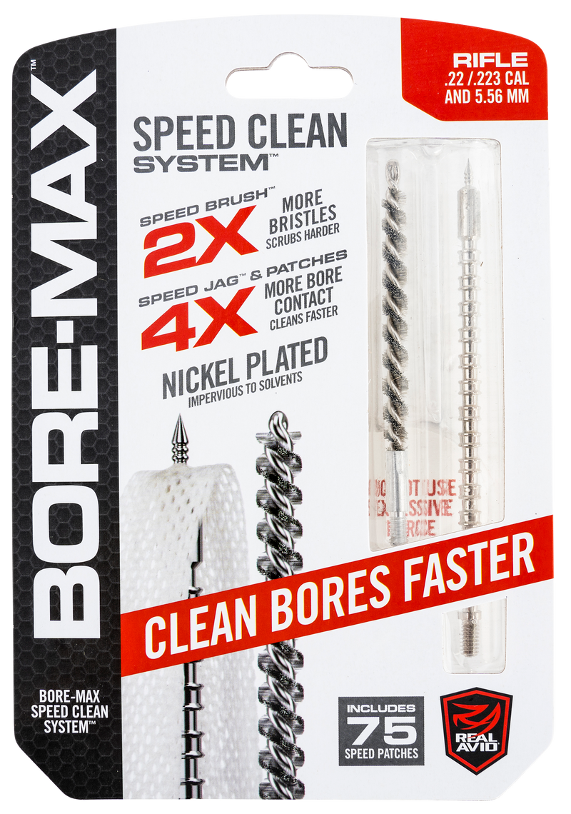 This upgrade set for .223 Rem/22 caliber rifles includes a speed brush, speed jag, and patches for efficient bore cleaning. Features nickel-plated construction and comes in a convenient blister pack. Designed to work with Real Avid's Bore-Max cleaning system.