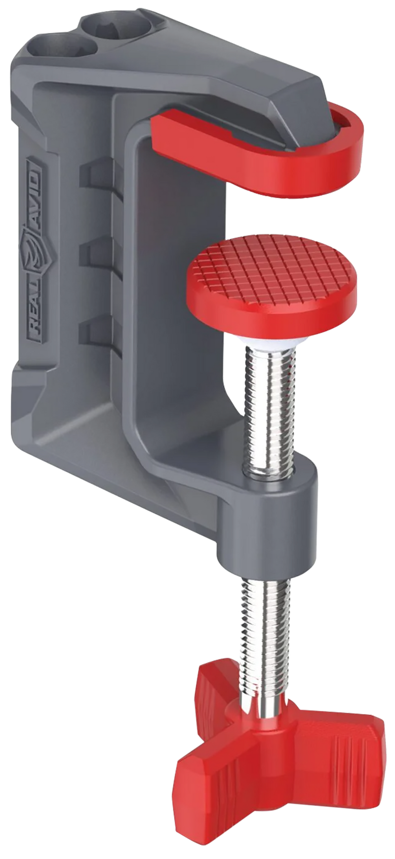 The Real Avid Smart Assist C-Mount is a gray and red plastic accessory designed to work with Real Avid's Smart Assist gunsmithing tool system. This mounting clamp provides a compatible interface for attaching and positioning Smart Assist accessories during firearms maintenance and assembly work.