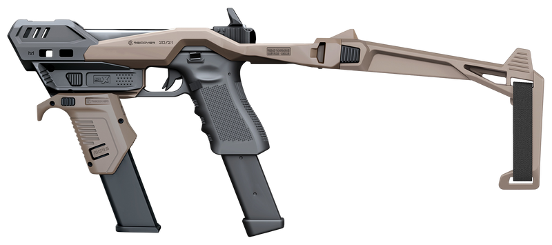 The Recover Innovations 2021 SLX Brace is a stabilizing brace designed for pistol-caliber firearms, featuring a tan finish. This accessory provides improved handling and control through an ergonomic design with dimensions of approximately 10.8" x 6.6" x 4.3". Installation is straightforward, making it a practical addition to compatible firearm platforms.