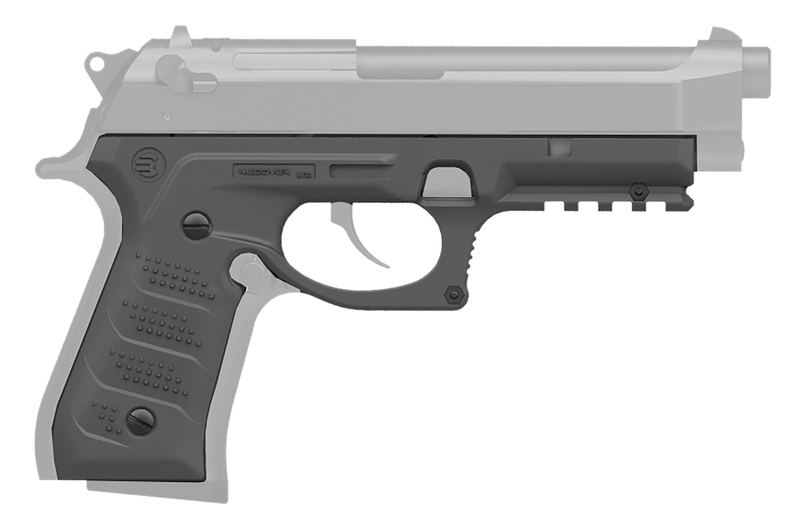 This is a grip and rail system designed for most Beretta 92 and M9 pistol models, constructed from gray polymer material. The system features Picatinny rail compatibility for mounting accessories and measures 8.4" in length with a 5.5" width and 1.2" height. It provides an ergonomic upgrade and accessory mounting capability for compatible handgun platforms.