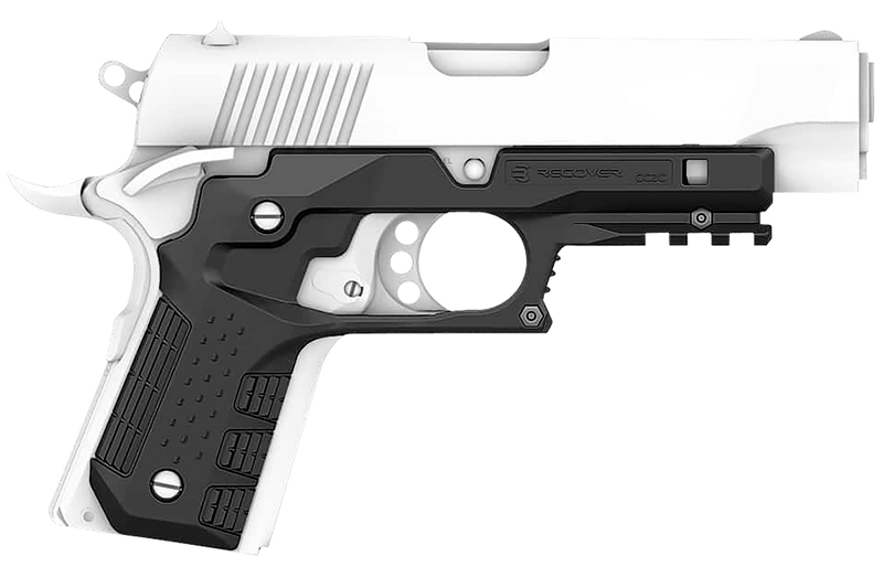 The Recover Tactical CC3C-01 is a grip and rail system designed for compact 1911 pistols, constructed from black polymer material. This accessory features a Picatinny rail for mounting optics or accessories. Dimensions measure 8.3" length x 5.5" width x 1.2" height.
