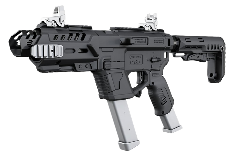 The Recover Tactical P-IX+ Basic is a pistol stabilizing brace designed for compatibility with Picatinny rail systems. It features a PG9 grip with integral magazine holder and includes a metal front guard for enhanced durability. The brace measures 14.8" in length and 7.1" in width, with a tube included for installation.