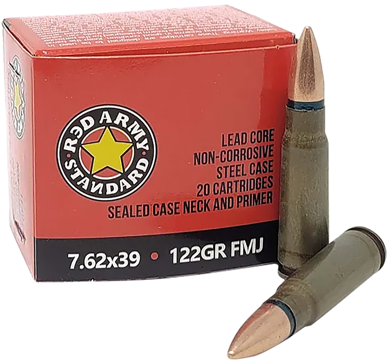 Red Army Standard 7.62x39mm ammunition loaded with 122-grain full metal jacket bullets in steel cases with sealed case necks and primers. This non-corrosive ammunition is suitable for target shooting and comes packaged with 20 rounds per box and 50 boxes per case.