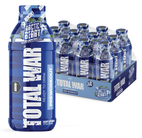 Redcon1 Total War Ready to Drink energy beverage in Rainbow Candy flavor, packaged as a 12-pack of 12 oz cans. This pre-mixed supplement is designed for consumers seeking convenient, ready-to-consume nutritional support. The compact packaging (11.2" x 10.1" x 6.4") makes it portable for outdoor activities.