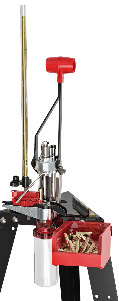 Heavy-duty cast-iron single-stage reloading press designed for serious reloaders, particularly those working with magnum cartridges. Features a large ram stroke and offset frame-and-ball handle for improved ergonomics. Accepts standard 7/8-inch-14 threaded dies.