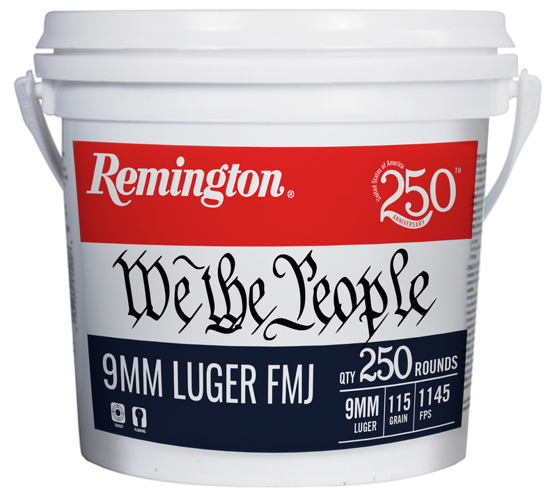 Remington UMC 9mm Luger ammunition loaded with 115 grain Full Metal Jacket bullets at 1145 fps muzzle velocity. This is packaged as 250 rounds per bucket, making it suitable for training and practice shooting. California restricted.