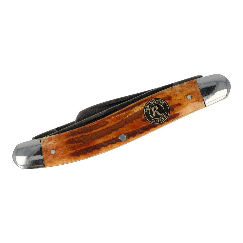 The Remington Backwoods Stockman is a folding knife featuring a coffee brown jigged bone handle with an inlaid antique medallion and stonewashed carbon steel blades. The clip point blade measures 3-1/2" with a plain edge, suitable for general cutting tasks and outdoor use. Made in China with 440 stainless steel construction on select models.