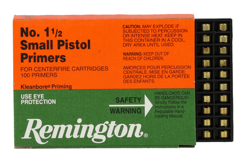 Remington small pistol centerfire primers for handgun reloading, packaged at 100 per box. These primers feature precisely controlled dimensions to four decimal places and a specially formulated priming mix designed for consistent ignition across a wide variety of powder types and temperature ranges from -20°F to +150°F. The unique tripod anvil design provides a larger sweet spot for maximum sensitivity and reliability.
