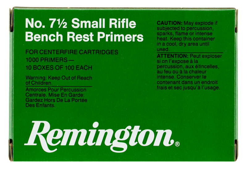 Remington Small Rifle Benchrest primers (7-1/2 BR) feature primer cup dimensions controlled to four decimal places and a specially formulated priming mix for consistent ignition across a wide variety of powder types. Individual primer pellet weight is controlled to 0.01 grams with a unique tripod anvil design that creates a larger sweet spot for maximum sensitivity. Tested for reliability over a temperature range of -20°F to +150°F; sold in boxes of 100 primers.