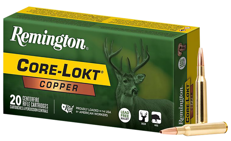 Remington Core-Lokt Copper rifle ammunition in .270 Win with 130gr copper hollow point bullets. Delivers 3060 fps muzzle velocity and 2703 ft-lbs of energy, with lead-free monometal construction designed for reliable expansion and weight retention on big game.