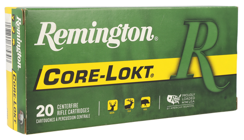 Remington Core-Lokt ammunition in 300 Winchester Magnum with 150-grain Pointed Soft Point bullets delivers 3290 fps muzzle velocity and 3605 ft-lbs of energy. The tapered copper jacket is locked to a solid lead core for controlled expansion and high weight retention on medium to large game. Brass-cased, reloadable rounds packaged 20 per box.