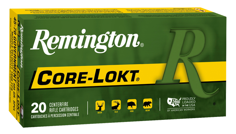 Remington Core-Lokt 45-70 Government 405 grain soft point ammunition delivers 1600 fps muzzle velocity and 2302 ft-lbs of energy from brass cases. The controlled expansion Core-Lokt bullet design provides reliable performance for big game hunting with high weight retention and consistent expansion.