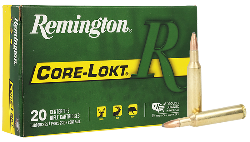 Remington Core-Lokt 6mm Rem ammunition features 100 grain pointed soft point bullets with a muzzle velocity of 3100 fps and 2134 ft-lbs of energy. The tapered copper jacket is locked to a solid lead core for controlled 2X expansion and consistent performance on big game. Each box contains 20 rounds with brass cases suitable for reloading.