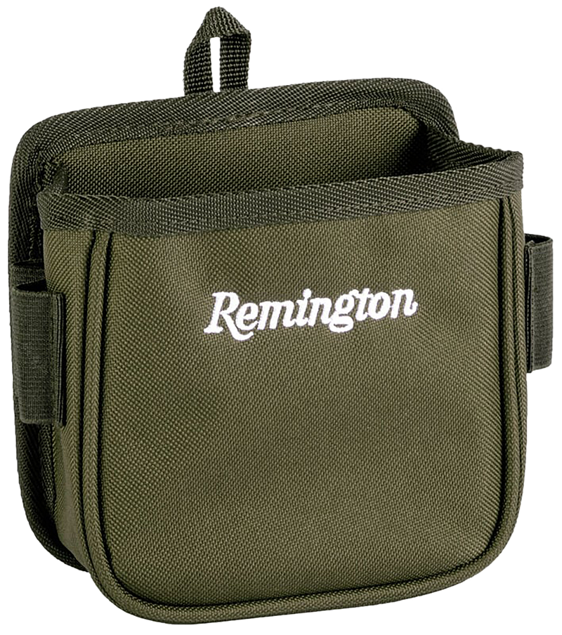 A single-box shotgun shell pouch designed for trap and skeet shooting with metal belt loop/clip and padded back panel. Features two shell loops on each side and web-bound edges for durability, with embroidered Remington logo. Constructed from green polyester material measuring 8.2" L x 6.0" W x 1.6" H.