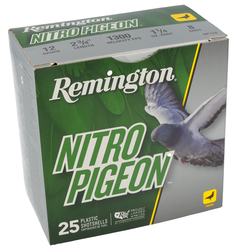 Remington Nitro Pigeon shotshells are 12 gauge loads featuring 1 1/4 ounces of #8 lead shot at 1300 fps velocity, designed for pigeon, dove, and upland game hunting. The plastic casing includes a Power Piston wad and high-performance propellant for tight patterns and consistent performance. This is a 25-round box packaged with 10 boxes per case.