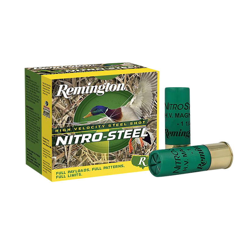Remington Nitro-Steel High Velocity shotshells in 12 gauge, 3" length with 1 3/8 oz of #2 steel shot. These zinc-plated steel loads are designed for waterfowl hunting and deliver 1300 fps muzzle velocity with premium round pellets for consistent pattern performance. Fully compatible with aftermarket ported and wad-stripping chokes.