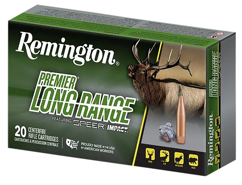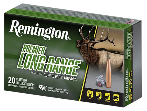 Remington Premier Long Range ammunition in 6.5 PRC with 140gr Speer Impact bullets delivers 2975 fps muzzle velocity and 2751 ft-lbs of energy. The Impact bullet features chemically bonded construction and a Slipstream Polymer Tip for high ballistic coefficient accuracy and reliable terminal performance on big game. Comes in boxes of 20 rounds with 10 boxes per case.