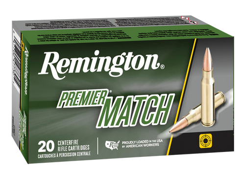 Remington Premier Match ammunition in .300 AAC Blackout features 125-grain Sierra MatchKing Open Tip Match bullets loaded to 2215 fps with 1362 ft-lbs of muzzle energy. This match-grade ammunition uses special loading practices for superior accuracy and consistency, ideal for precision target shooting and competitive applications. Packaged in boxes of 20 rounds with brass casings.