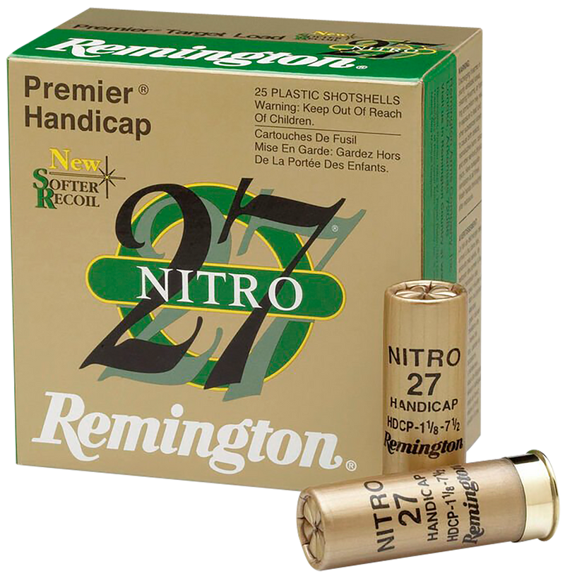 Remington Premier Nitro 27 Handicap target loads in 12 gauge with 1 oz of #7.5 lead shot. These plastic hull shells deliver 1290 fps muzzle velocity and are designed for trap, skeet, and sporting clay competition shooting. High brass construction provides reliable performance and hull longevity.