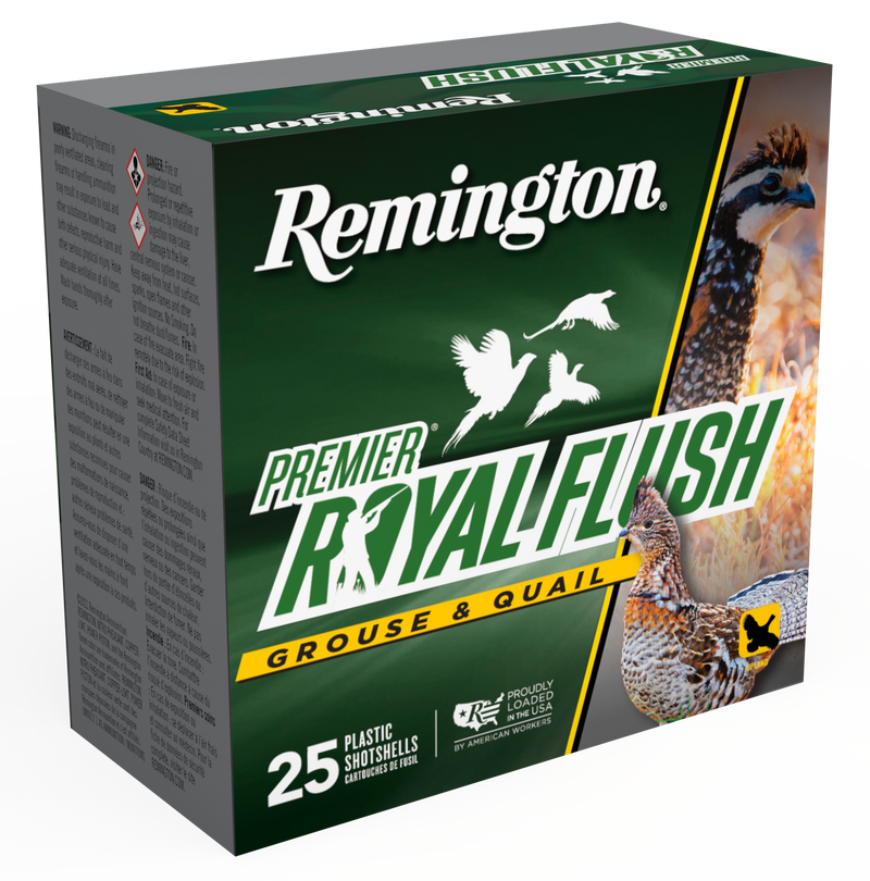 Remington Premier Royal Flush shotshells in 20 gauge with 2-3/4" cases, 1oz copper-plated lead shot (#7.5), and 1220 fps velocity. Designed for upland game bird hunting with magnum-grade copper plated payload for knock-down power. Available in 25-round boxes.