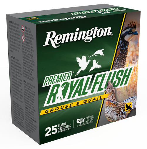 Remington Premier Royal Flush 20 gauge 3" magnum shotshells loaded with 1 oz of copper-plated lead shot in #6 size, delivering 1,450 fps velocity. Designed for upland game birds and small game hunting with high brass plastic cases. Each box contains 25 rounds.