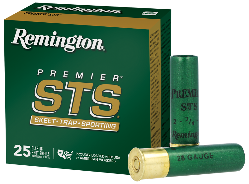 Remington Premier STS Target Loads in 28 gauge with 2.75" plastic cases deliver 3/4 oz of #9 lead shot at 1200 fps. Designed for trap, skeet, and sporting clays competition, these shells offer consistent shot-to-shot performance and are popular with reloaders for their reloadability.
