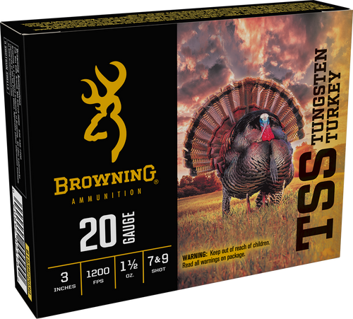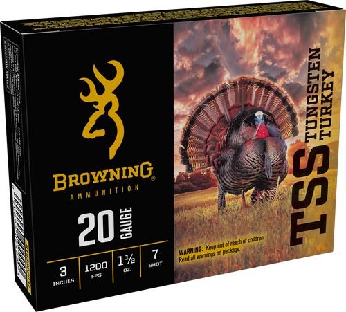 Remington Premier TSS Turkey shotshells are designed for turkey hunting with 20 gauge, 3" shells loaded with 1-1/2 oz of ultra-dense tungsten super shot (TSS) at 1100 fps. The high-density tungsten (18 g/cc) delivers tighter patterns and more knockdown power than traditional lead loads, making these premium hunting rounds ideal for hunters seeking increased lethal range and consistency.