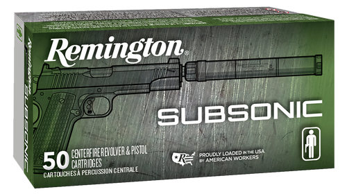 Remington Subsonic 9mm Luger ammunition features 147-grain flat nose enclosed base bullets designed for use with suppressors. This load produces 945 fps velocity and 291 ft-lbs of energy, delivering subsonic performance without supersonic crack. Brass casing with Boxer primer and 50 rounds per box.