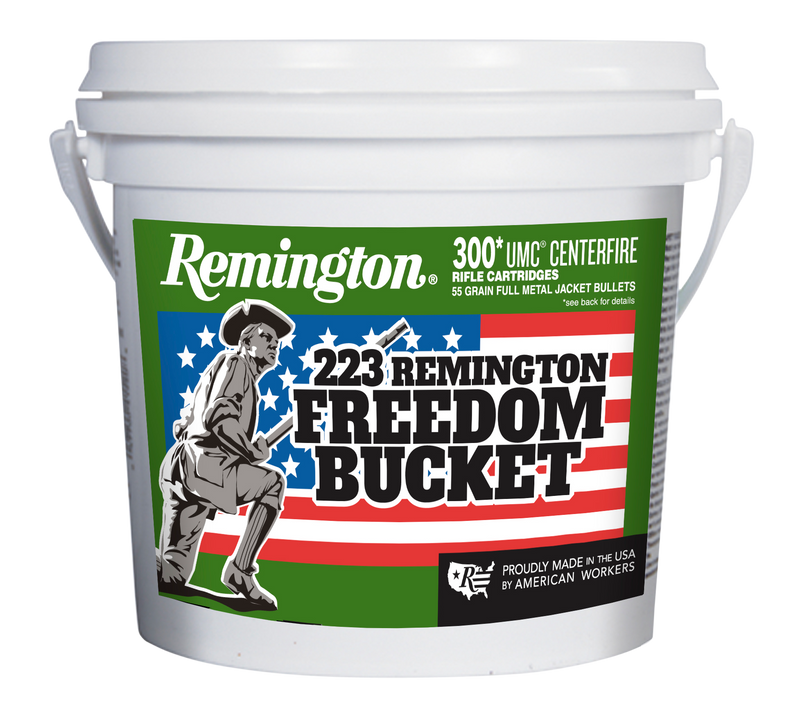 Remington UMC Freedom Bucket ammunition in .223 Rem features 55-grain full metal jacket bullets loaded to 3240 fps with 1282 ft-lbs of muzzle energy. This high-volume target and training ammunition comes in a 300-round bucket (4 boxes per case) with brass casings and is manufactured in the USA.