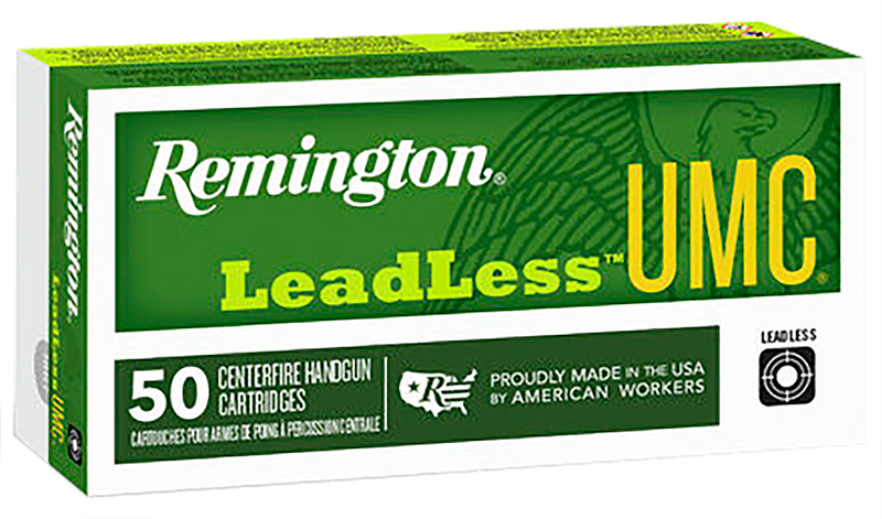 Remington UMC Leadless 40 S&W ammunition features 180-grain flat nose enclosed base bullets loaded to 990 fps muzzle velocity with 392 ft-lbs of energy. This American-made ammunition uses first-quality factory-fresh brass cases and clean-shooting Kleanbore primers, suitable for target shooting and personal protection applications.
