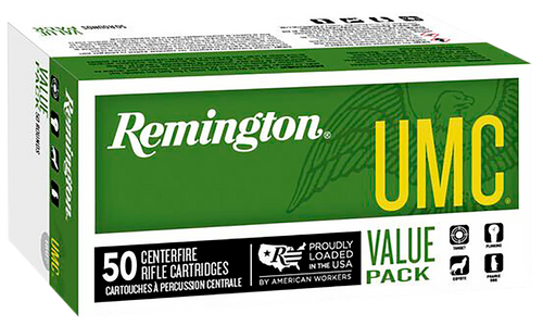 Remington UMC 22-250 Rem centerfire rifle ammunition loaded with 50-grain jacketed hollow point bullets, delivering 3820 fps muzzle velocity and 1620 ft-lbs of energy. This value-pack ammunition is suitable for varmint hunting, target shooting, and high-volume training with brass cases and boxer primers. Each box contains 40 rounds, with 10 boxes per case.