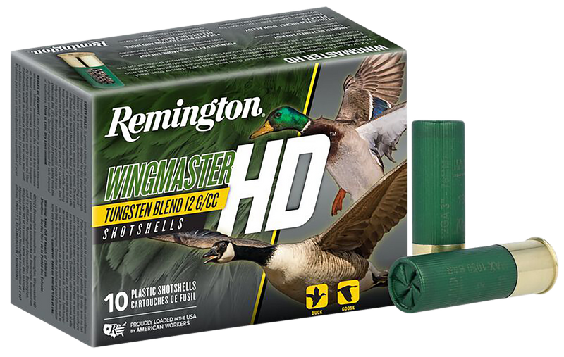Remington Wingmaster HD is a 12 gauge 3" magnum waterfowl load featuring 1.5 oz of #2 tungsten shot at 1300 fps. The tungsten blend is 6% denser than lead and 49% denser than steel, delivering superior pattern density and retained energy for duck and goose hunting. High brass plastic casing with excellent choke response and reduced wear on barrels compared to other tungsten loads.