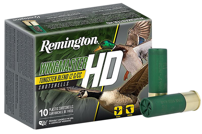 Remington Wingmaster HD shotshells are loaded with a tungsten blend shot that is 6% denser than lead and 49% denser than steel, delivering superior pellet energy and pattern density for waterfowl hunting. These 12 gauge 3" shells contain 1 1/4 ounces of #4 shot at 1450 fps, designed for enhanced penetration and consistent patterns. The tungsten blend is nearly as soft as steel, providing excellent choke response similar to lead while being easier on barrels and choke tubes.