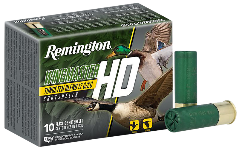 Remington Wingmaster HD is a 12 gauge 3" waterfowl hunting round loaded with 1 3/8 ounces of #2 tungsten blend shot at 1450 fps. The tungsten blend is 6% denser than lead and 49% denser than steel, delivering superior pattern density and retained energy with less barrel wear than traditional tungsten loads.