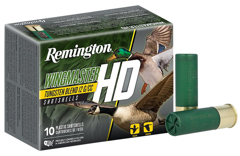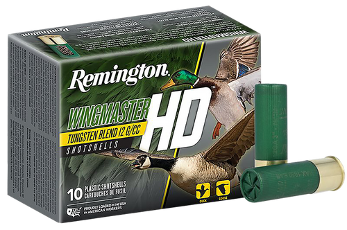 Remington Wingmaster HD shotshells are 12 gauge 3" rounds loaded with 1 3/8 oz of tungsten blend #6 shot at 1450 fps, designed for waterfowl hunting. The tungsten blend is 6% denser than lead and 49% denser than steel, delivering excellent pattern density and retained energy with minimal barrel wear.