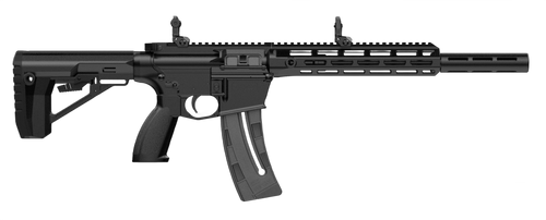 Semi-automatic AR-platform rifle chambered in .22 LR with a 16" barrel and matte black finish. Features a polymer M-LOK handguard, adjustable stock, and flip-up front and rear sights. Includes one 10-round magazine.