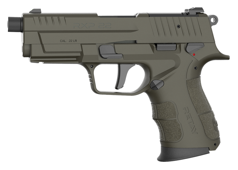 The Retay RXP22 is a semi-automatic, compact polymer-frame pistol chambered in .22 LR with a 4" threaded barrel and 10-round capacity. Features include an optics-ready slide, textured grip, ambidextrous manual safety, fiber optic front sight, and comes with 2 magazines. The OD Green Cerakote finish and polymer construction make it suitable for training, target shooting, and range use.