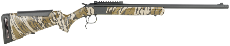 The Retay Gamelander is a 410 gauge single-shot shotgun with a 22" barrel and 3" chamber, featuring a black deep bore barrel and drilled & tapped receiver with Picatinny rail for optics mounting. The adjustable length-of-pull synthetic stock in OG Bottomland camouflage and bead front sight make it suitable for small game hunting. This lightweight firearm weighs 6.70 lbs and measures 33.5" overall.