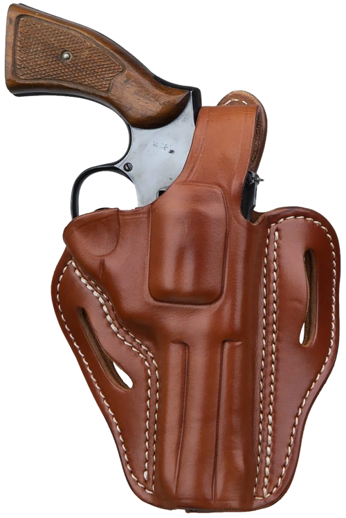 Outside-the-waistband (OWB) leather holster designed for revolvers, featuring a belt slide mount for right-hand draw. Crafted from natural leather in classic brown, this Size 3 holster accommodates multiple revolver models and measures 9.3" x 2.7" x 9.3".