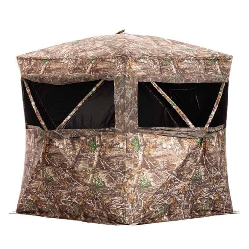 The RB24 Pro is a 60" x 60" ground blind with 270-degree visibility designed for bow and gun hunters. It features durable 600 Denier exterior fabric in Realtree Edge camouflage, enhanced interior height, and a silent slide window system with see-through mesh. The blind weighs 17.4 lbs and includes improved ground stakes for secure setup.