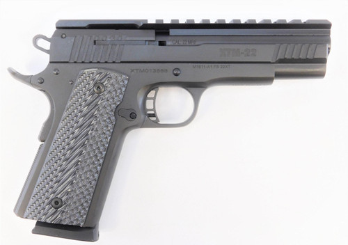 Semi-auto 1911-style pistol chambered in .22 Magnum with a 5" pinned solid state barrel and delayed blowback slide. Features a crisp 4-6 pound factory trigger, rear adjustable sights with front fiber optic sight, skeletonized hammer and trigger with adjustable overtravel stop, and rock-tough parkerized finish with fitted G10 grips.