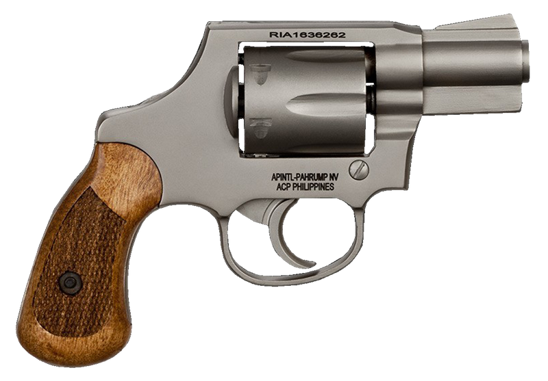 Double/Single action revolver chambered in .38 Special with a 2" matte nickel barrel and 6-round capacity. Features a spurless (concealed) hammer, checkered wood grips, and fixed ramp front/notch rear sights. Weighs approximately 1.5 lbs with an overall length of 6.88 inches, making it suitable for concealed carry.