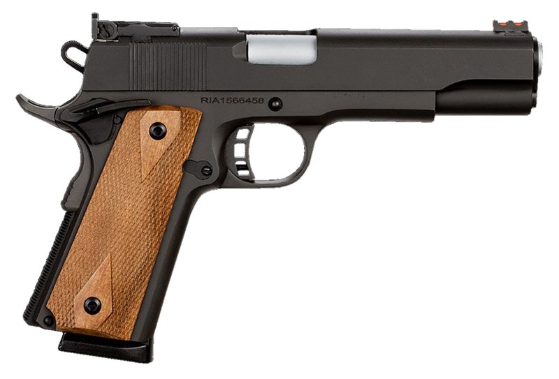 Single-action semi-auto 1911-style pistol chambered in 45 ACP with a 5" barrel and 8+1 capacity. Features adjustable rear sight with high-visibility fiber optic front sight, skeletonized hammer, and factory 4-6 pound trigger with adjustable over-travel stop. Built by Rock Island Armory's master gunsmiths as a competition-ready match-grade pistol with full parkerized finish and checkered wood grips; weighs 46.5 oz.