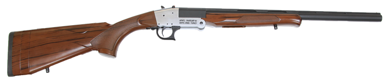 Single shot break-action shotgun in 20 gauge with a 3" chamber and 20" contoured barrel. Features adjustable ghost ring sights, synthetic stock with wood grain finish, and includes two interchangeable butt pads for different length of pulls. Weighs 5.18 lbs with an overall length of 36.61 inches.