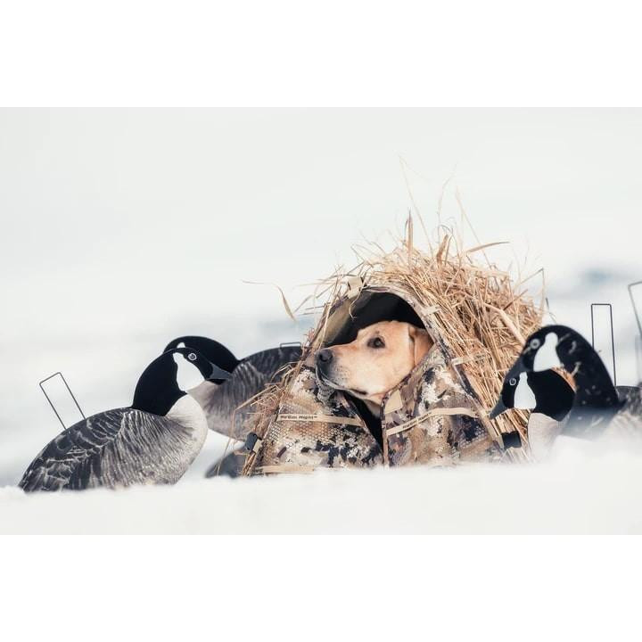 A portable dog blind featuring a patent-pending Bullycoil frame system that sets up in seconds and compresses flat for storage with no pins, hinges, or poles. The blind uses GORE Optifade Marsh camouflage and buckles closed for quick deployment. Designed for hunting applications where dogs need concealment in marsh environments.