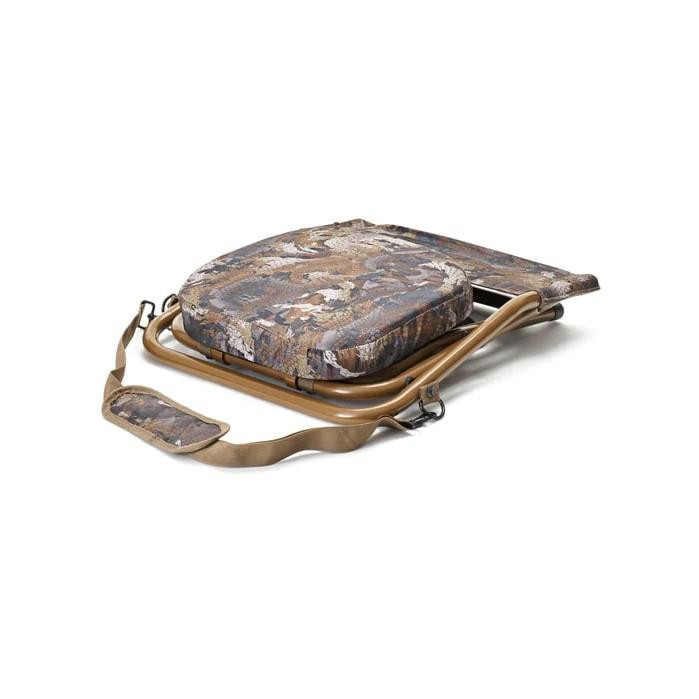 The Hyde Stool is a portable, padded hunting seat with a patent-pending design that folds flat for transport. It features a comfortable padded seat with backrest support, steel construction with powder coat finish, and is rated for up to 500 lbs weight capacity. Ideal for use in A-frame panel blinds, boat blinds, or dove hunting applications.
