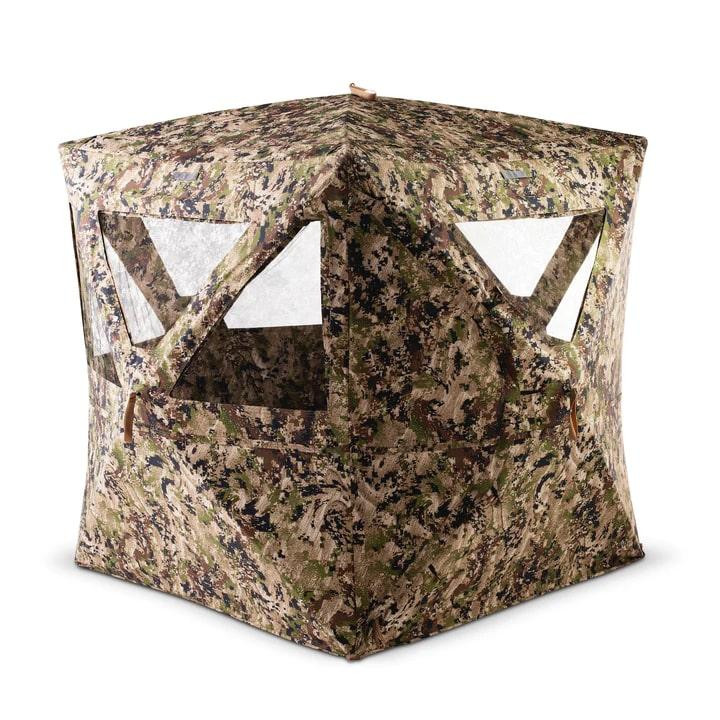 This ground blind features a camo interior design to minimize the "black hole effect" and help hunters blend seamlessly into their surroundings without wearing dark clothing. Constructed from 300D material and weighing 19 lbs, it includes a camo-wrapped carrying case and backpack for discreet transport. The blind is designed to complement SITKA Gear and other quality hunting apparel.