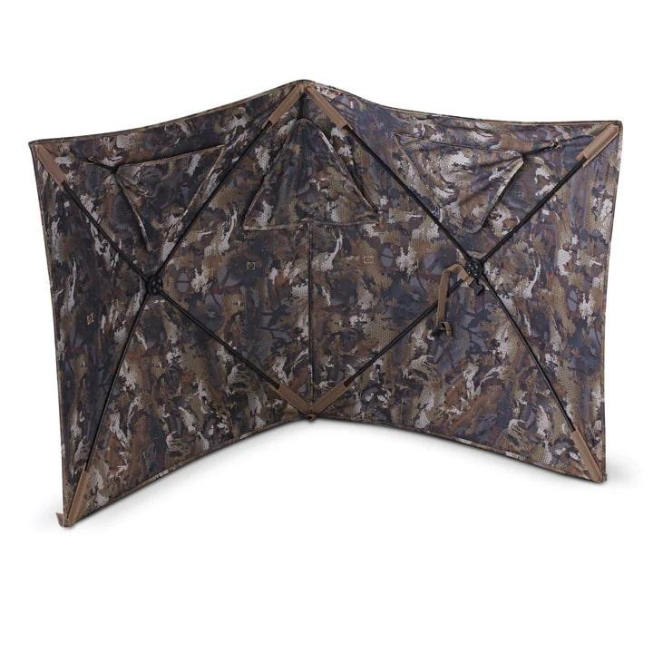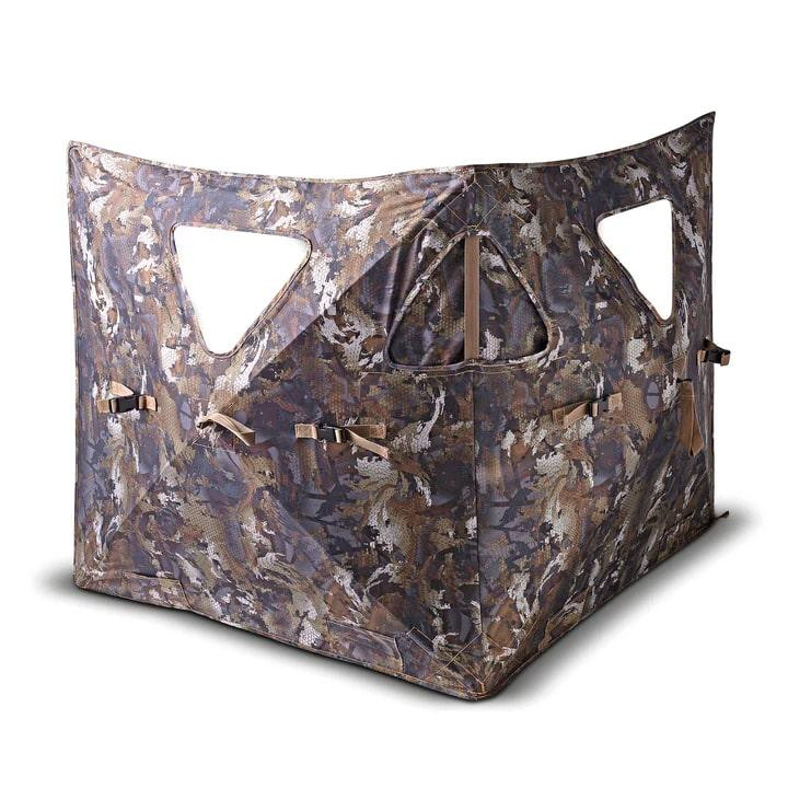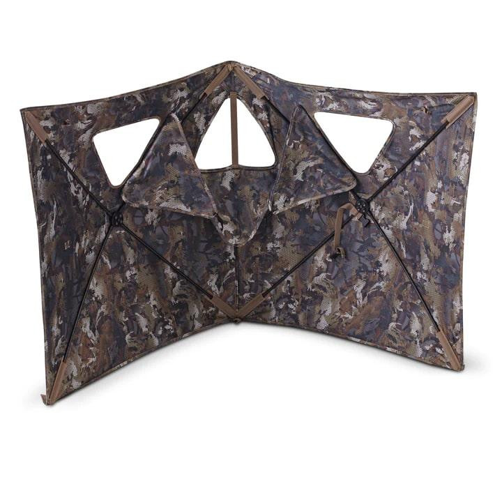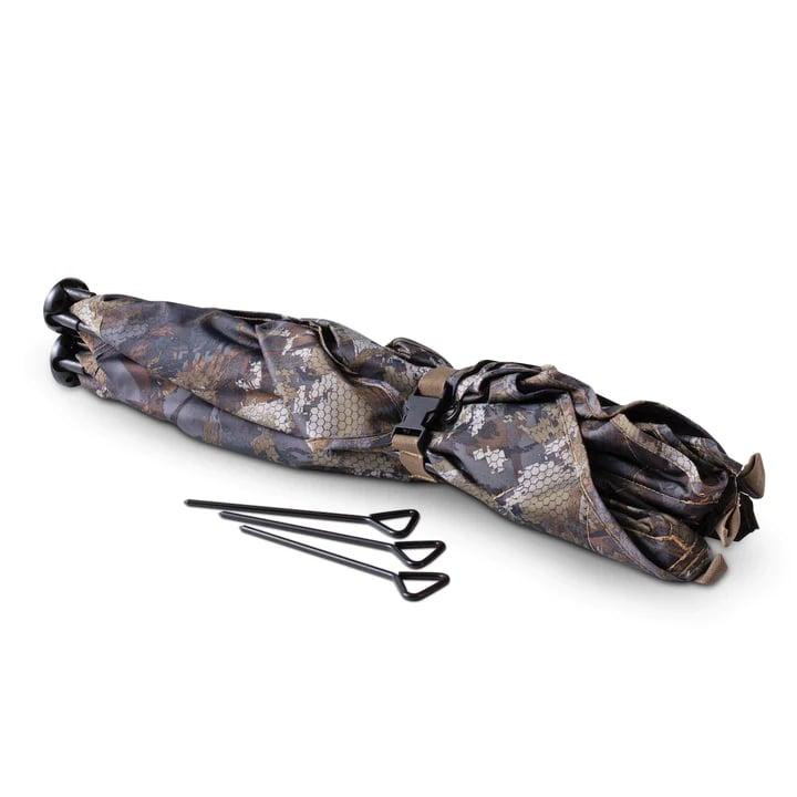 The HydeOut Go is a compact two-hub hunting blind designed for mobile hunters pursuing turkey, deer, elk, antelope, and other game. It features camouflage material on both front and reverse sides for concealment from all angles, plus a stubble strap system for attaching native vegetation. The blind includes metal tent stakes and is designed for minimalist, run-and-gun hunting setups.