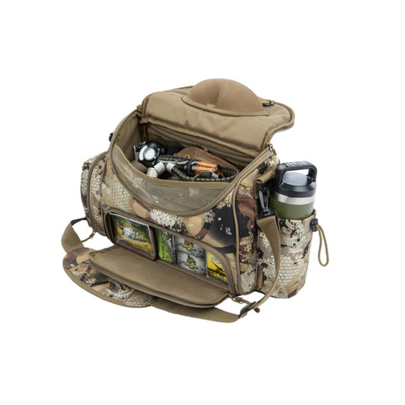 A compact guide-style hunting blind bag featuring a molded ammo compartment, hard bottom molded sunglasses case, drink holder pocket, and clear internal pockets. The bag includes a separated main compartment for essentials and is constructed for durability and performance. Available in Mossy Oak Original Shadowgrass camouflage pattern.